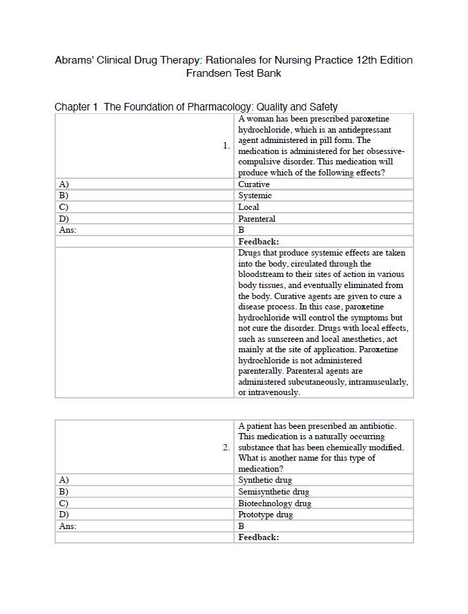 Test Bank for Abrams Clinical Drug Therapy Rationales for Nursing Practice, 12th Edition Frandsen PDF | Instant Download | All Chapters Included