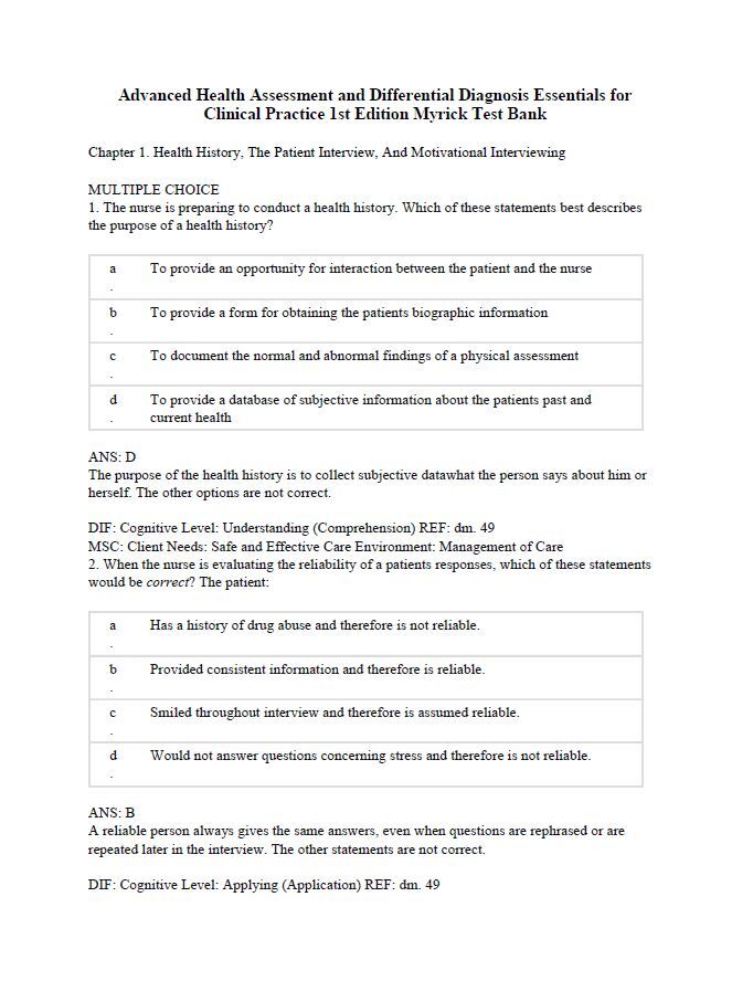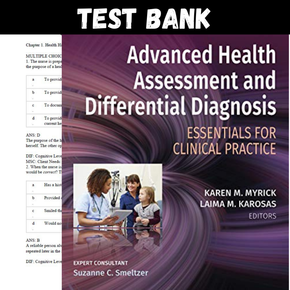 Test Bank for Advanced Health Assessment and Differential Diagnosis Essentials 1st Edition Myrick PDF | Instant Download | All Chapters Included